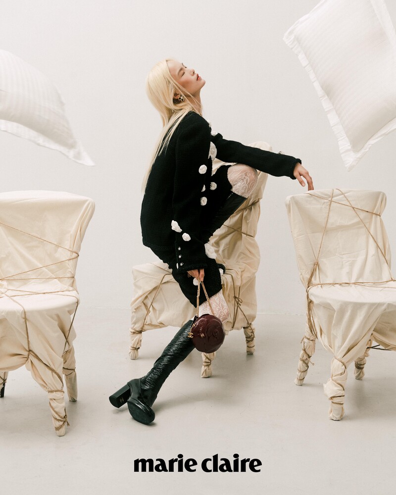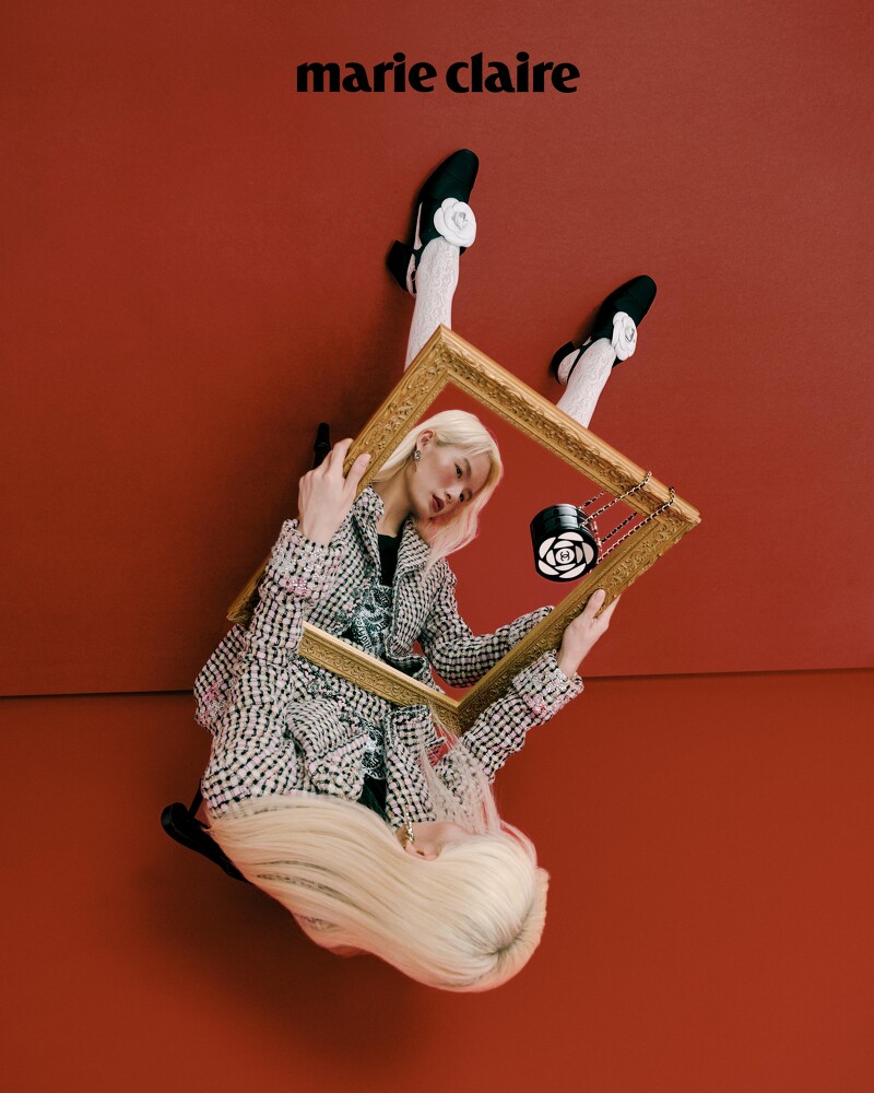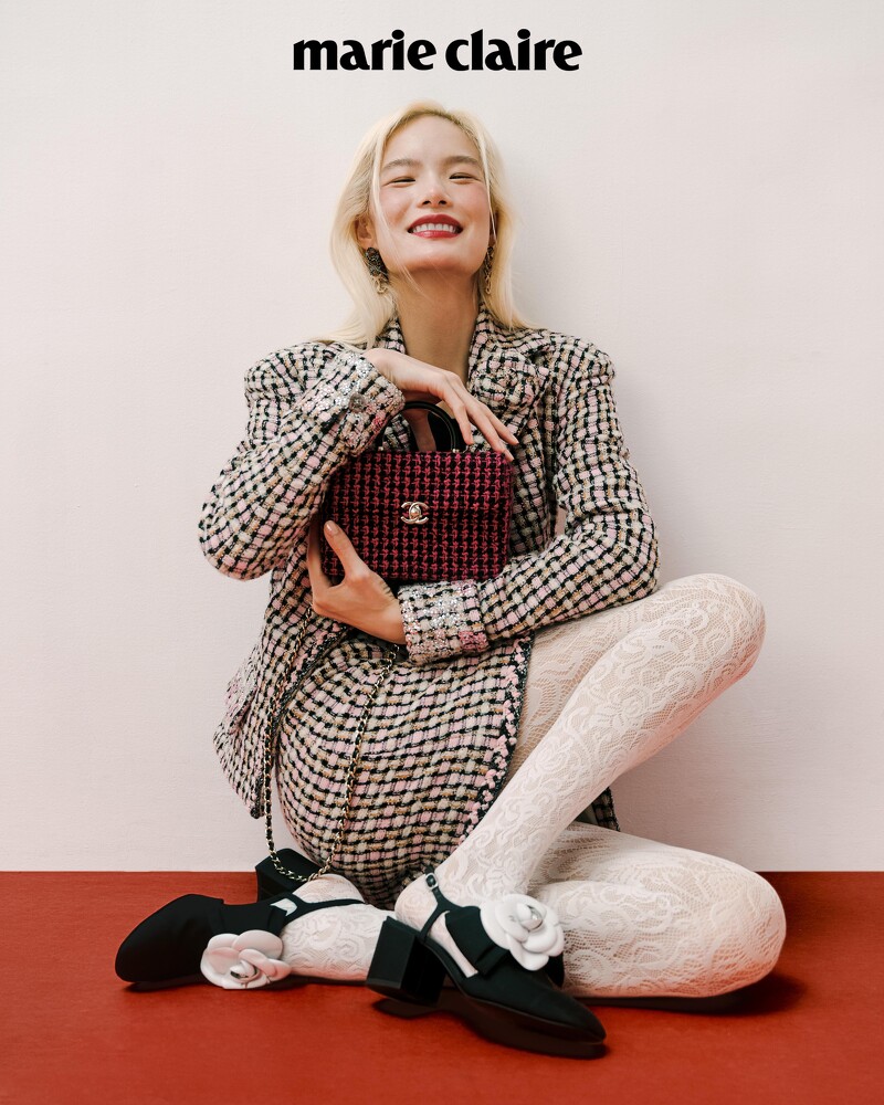 粉色斜纹软呢格纹外套与短裙、黑色山茶花上衣、白色蕾丝丝袜、白色山茶花低跟鞋、粉色斜纹软呢皮穿鍊手提包,all by CHANEL;彩妆 ,CHANEL BEAUTY。 举报