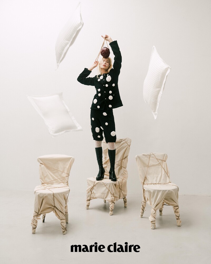 将冬日山茶花的纯洁娇嫩绽放在大衣、毛衣、针织衫上,点缀于口袋、外套、钮扣,幻化为各式各样的山茶花图样,交织褪色效果、乾燥玫瑰色,持续蔓延浪漫氛围,展现华丽且充满女性柔美气息的创意宇宙。