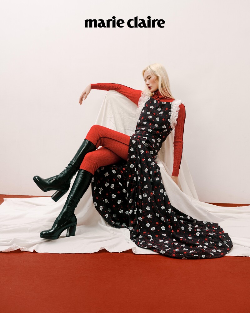 山茶花印花丝质露背长洋装、红色高领针织衫、红色针织紧身长裤、黑色亮片皮革长靴,all by CHANEL;彩妆,CHANEL BEAUTY。 鞋包配件也是满满山茶花身影