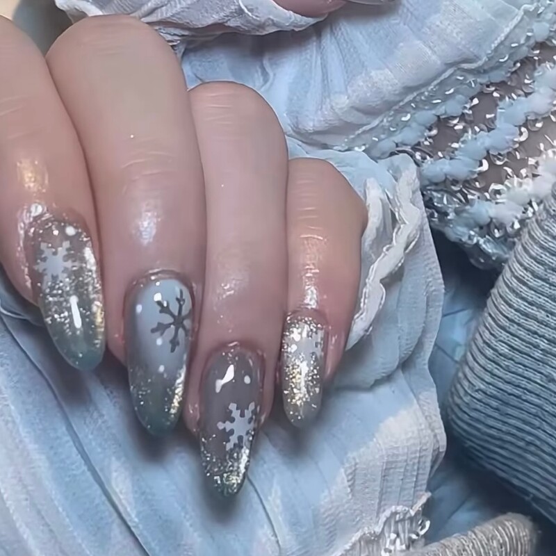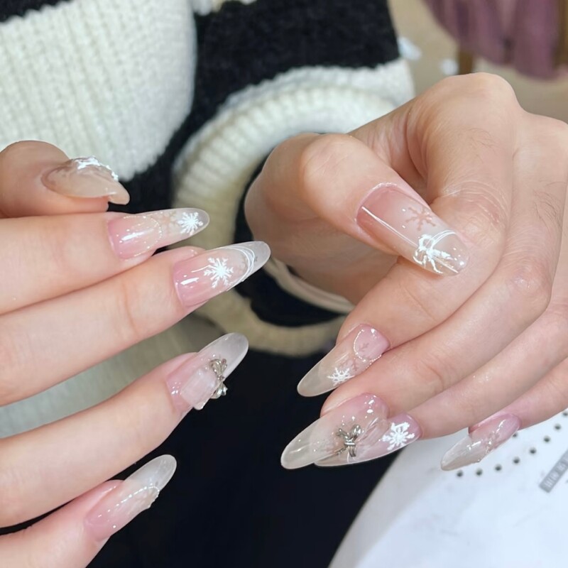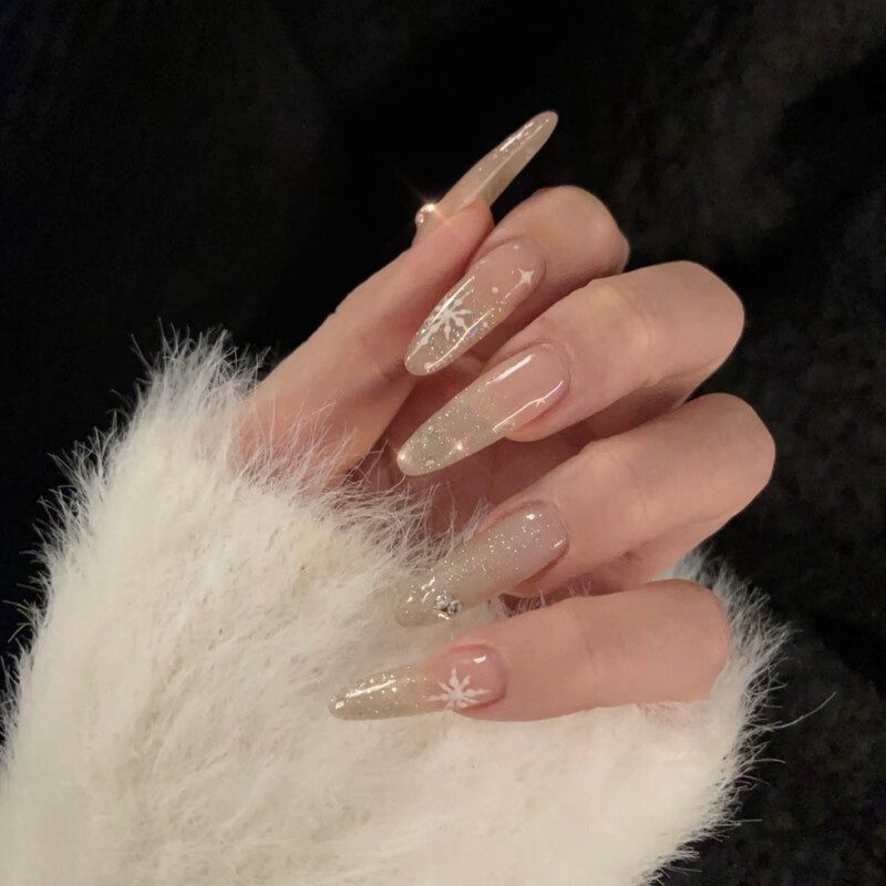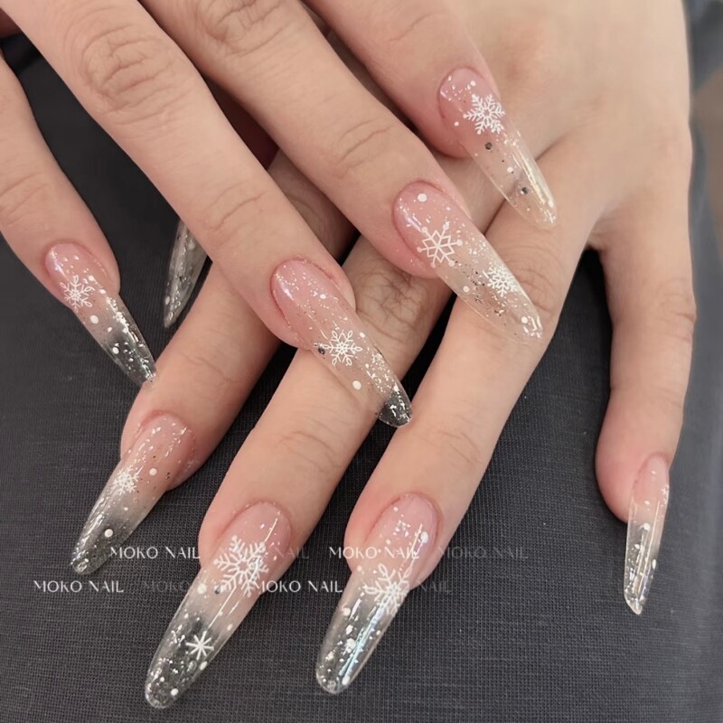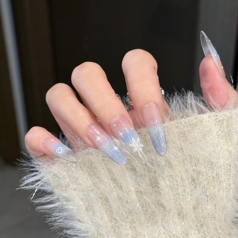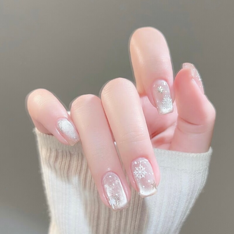 以延长甲面的方式展现底色的半透明感,点缀上的白色的雪花,整体非常有冬天的感觉。