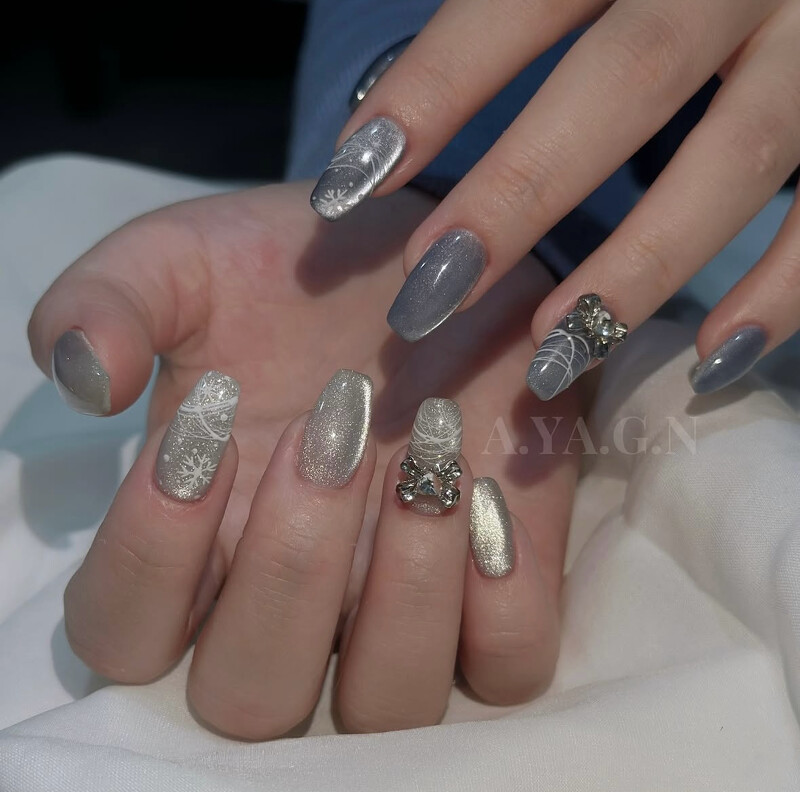 近期流行的猫眼当然也可以加上雪花点缀,在动动手指时更能感受到光影变幻,更有华丽感。