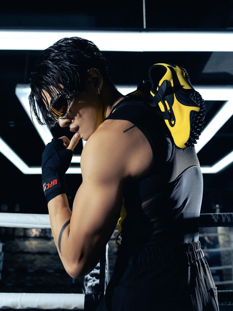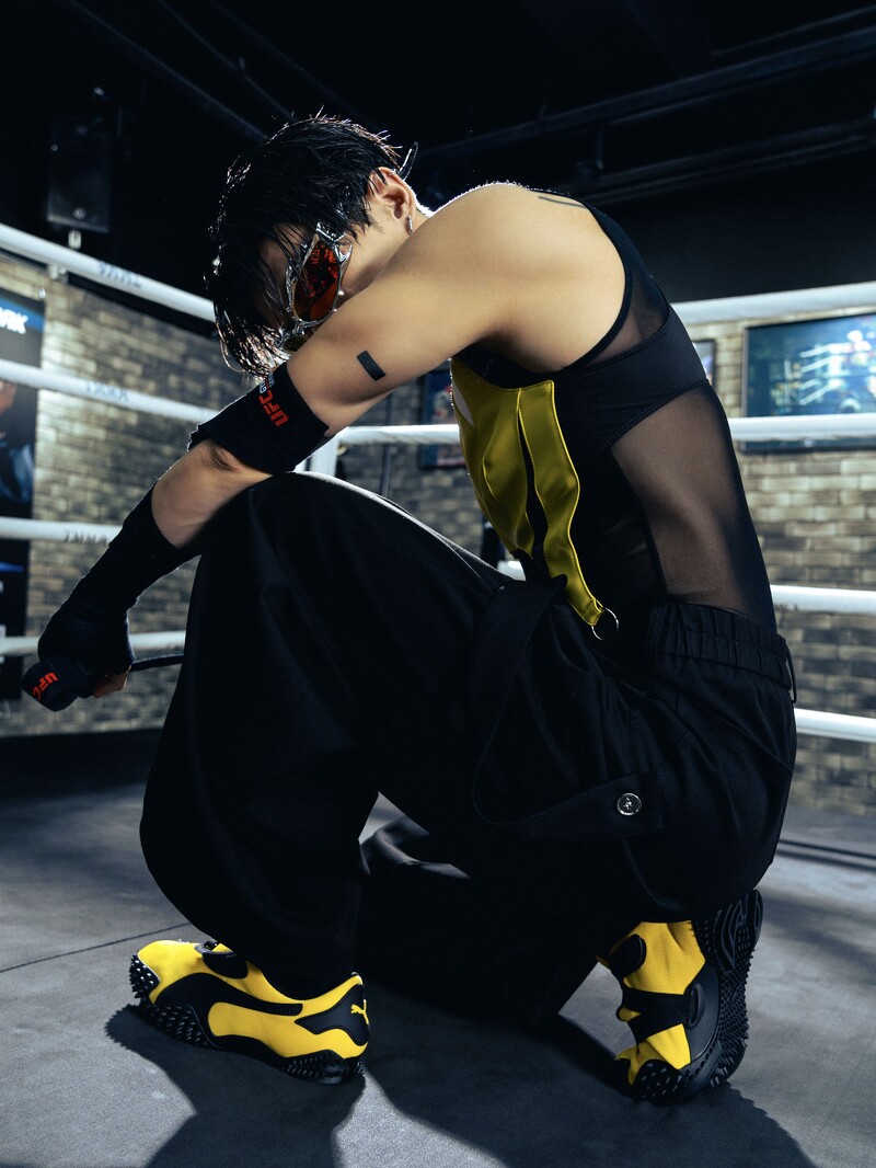 而常以性感造型亮相的 Kire 此次也选择挖空亮色系背心搭配深色落地宽裤,以时髦的宽鬆风格表达属于自己的风格与自信,脚上的亮黄色 MOSTRO也呼应了他对于创作与风格的无所畏惧与前卫态度!
